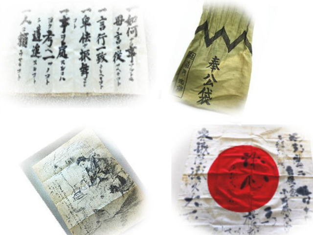 - 千人針、奉公袋、戦地からの手紙(家族あて、戦友から など)、寄せ書きの日の丸 など